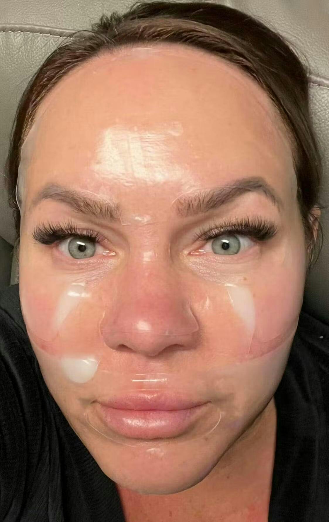 1st impression after putting their serum on 1st and leaving the mask on for 2hrs… little to no smell, this mask barely moves at all (best mask for staying in place I’ve ever used and I’ve used more than 50), I cut it to make it more comfortable for me because I hate stuff on my face but this did not bother me much however after 2hrs I was done. I would not be able to sleep in it as I can’t even make it thru the night with a hair tie staying in or my pillow case coming off I am a very active sleeper lol so that’s why I decided to try it during the day. After removing the mask my face is very glazed and hydrated and I used all the excess liquid from package to rub on my neck, chest, hands and hubbys face no reason to waste a good product. I will update u as to how hydrated my face is tomorrow when I wake up but the pics below are when I first applied, 1hr in, 1.5hrs in and removing the mask.
