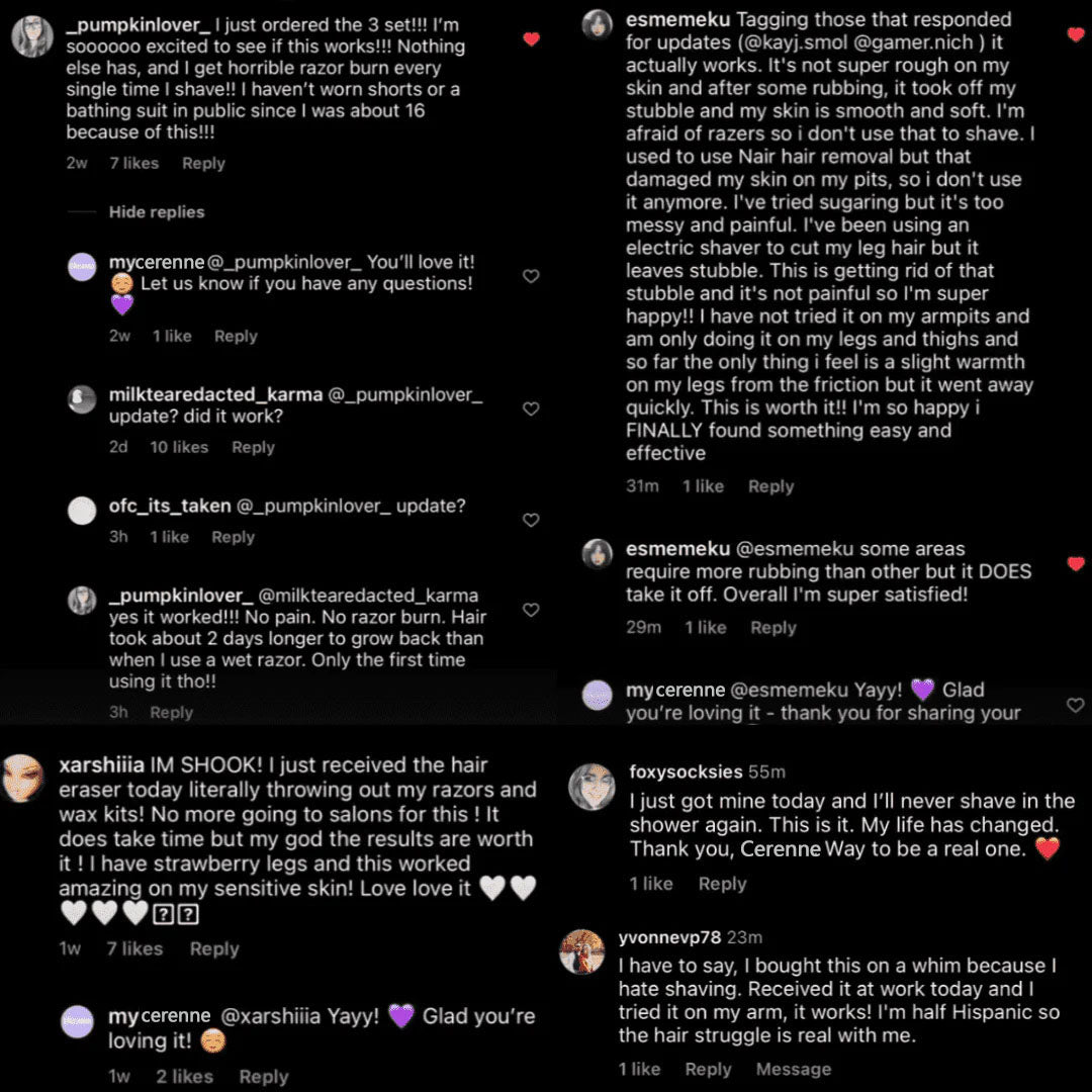 We love our Cerenne™ Crystal Hair Eraser and are confident you will too! That’s why we’re offering a 30-Day Guarantee. If you’re not satisfied, we’ll be happy to review your case and see how we can help! 💜